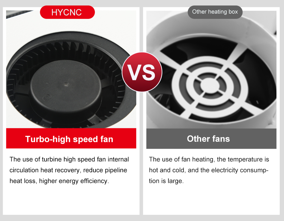 The use of turbine high speed fan internal circulation heat recovery, reduce pipeline heat loss, higher energy efficiency.