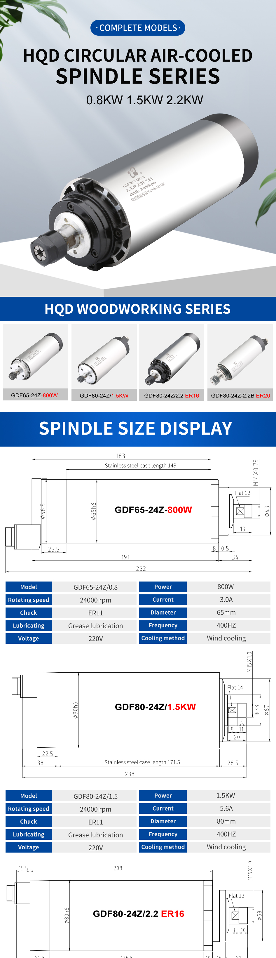 HQD Round Air-cooled Spindle Series 0.8KW-2.2KW